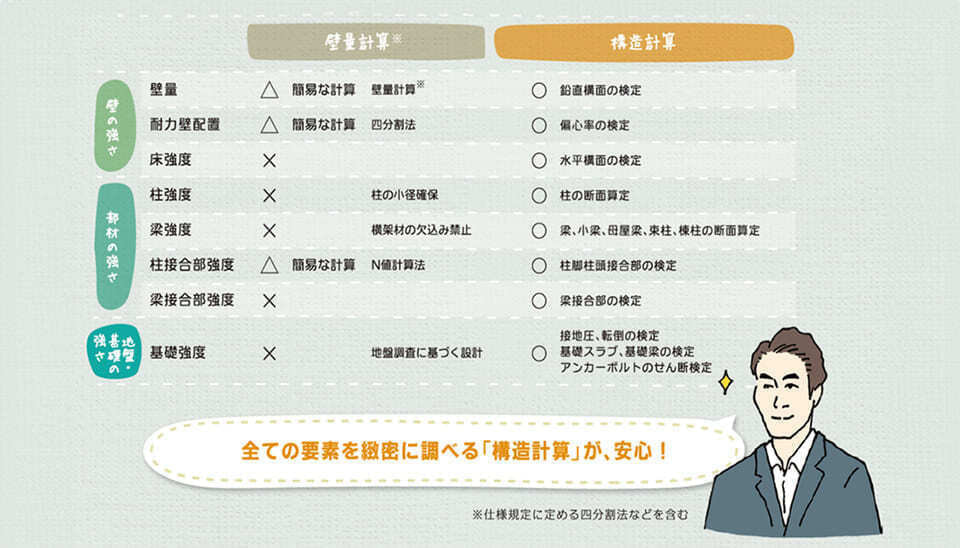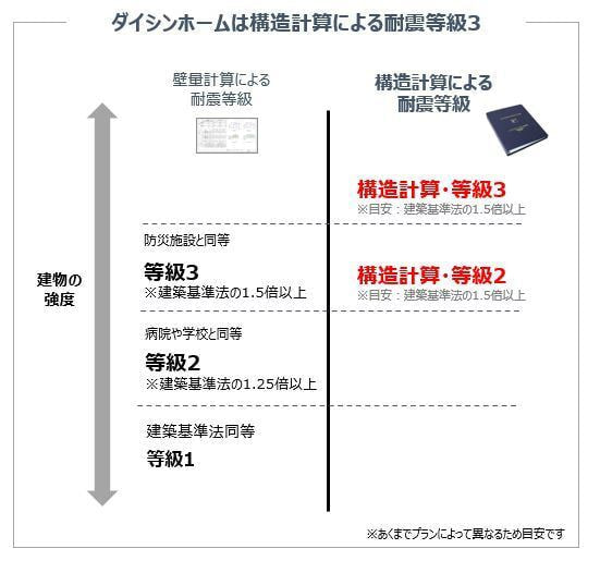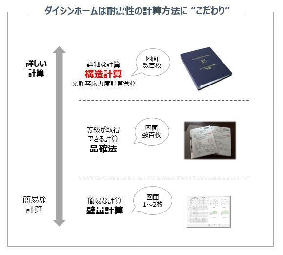 このような計算方法の「違い」が、実際の家の耐力の「違い」につながっており、ダイシンホームはこの「違い」に着目して、地震に強い家づくりをおこなっています。